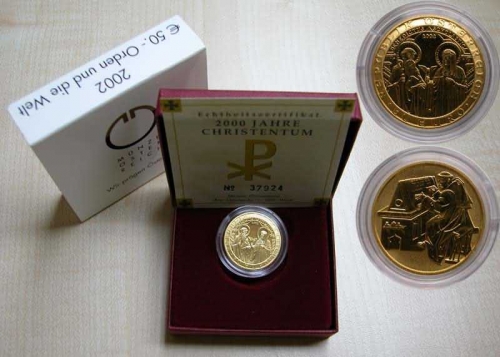 Вы всегда можете купить или продать, а также узнать текущую стоимость монеты - '50 евро 2002 года "2000 лет Христианства, Орден и Мир", 10 гр.' в г. (). У нас Вы получите полную и необходимую консультация от квалифицированных специалистов и профессионалов, работающих на рынке инвестиций в драгметаллы уже долгое время. Мы стараемся предложить нашим клиентам лучшие цены выкупа и продажи на рынке (с минимальным спредом), а также гарантируем конфиденциальность всех проводимых сделок.