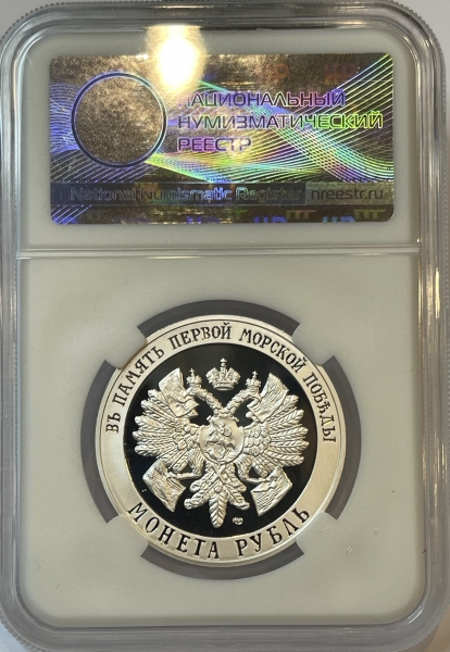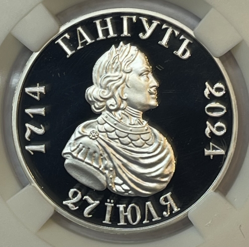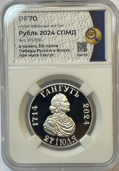 Монетовидный жетон рубль 2024г., В память 310-летия Победы Русского флота при мысе Гангут, Тираж 350 шт, в слабе ННР PROOF 70