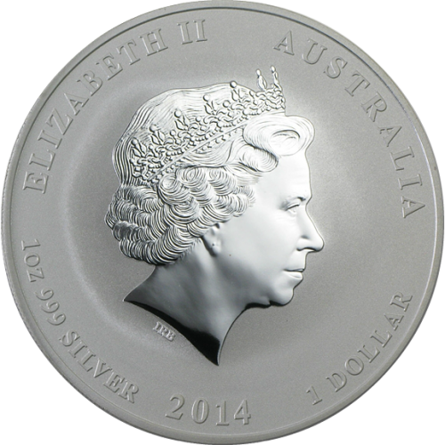 На аверсе монеты нанесено рельефное изображение Ее Величества Елизаветы II. Вокруг портрета отчеканена следующая информация: имя королевы - Елизавета II, номинальная стоимость - 1 австралийский доллар, масса чистого металла – 1 oz (31,1 г), проба - 999, серебро, год чеканки - 2014, страна эмитент – Австралия.