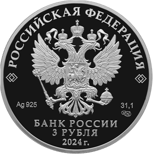 рельефное изображение Государственного герба Российской Федерации, над ним вдоль канта – надпись полукругом «РОССИЙСКАЯ ФЕДЕРАЦИЯ», обрамленная с обеих сторон сдвоенными ромбами, под гербом слева – обозначения драгоценного металла и пробы сплава, справа – содержание химически чистого металла и товарный знак монетного двора, внизу в центре в три строки – надпись «БАНК РОССИИ», номинал монеты «3 РУБЛЯ», год выпуска «2024 г.».