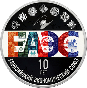 надпись «ЕАЭС», выполненная в цвете поверх матовой рельефной площадки; вверху – выполненные в технике лазерного матирования эмблема ЕАЭС и, полукругом, орнаменты государств – участников ЕАЭС и государств – наблюдателей ЕАЭС Кубы и Узбекистана; внизу – рельефные надписи: по окружности – «ЕВРАЗИЙСКИЙ ЭКОНОМИЧЕСКИЙ СОЮЗ», над ней в две строки – «10 ЛЕТ».