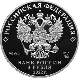 на зеркальном поле диска — рельефное изображение Государственного герба Российской Федерации, над ним вдоль канта — надпись полукругом: «РОССИЙСКАЯ ФЕДЕРАЦИЯ», обрамленная с обеих сторон сдвоенными ромбами, внизу под гербом: слева — обозначения драгоценного металла и пробы сплава, справа — содержание химически чистого металла и товарный знак монетного двора, внизу в центре в три строки — надпись: «БАНК РОССИИ», номинал монеты: «3 РУБЛЯ», год выпуска: «2022 г.».