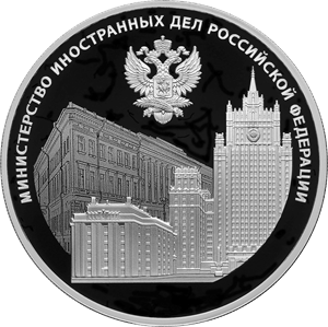 на зеркальном поле диска — рельефное изображение здания Министерства иностранных дел Российской Федерации, расположенного на Смоленской-Сенной площади в Москве, а также изображение восточного корпуса здания Главного штаба на Дворцовой площади в Санкт-Петербурге, где до 1917 года размещалось Министерство иностранных дел Российской Империи; в верхней части монетного поля — рельефное изображение эмблемы Министерства иностранных дел Российской Федерации; вверху вдоль канта — надпись: «МИНИСТЕРСТВО ИНОСТРАННЫХ ДЕЛ РОССИЙСКОЙ ФЕДЕРАЦИИ».