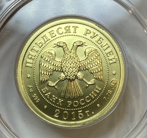 В центре – эмблема Банка России (двуглавый орёл с опущенными крыльями, под ним – надпись полукругом "БАНК РОССИИ"), обрамленная кругом из точек и надписями по кругу – вверху: "ПЯТЬДЕСЯТ РУБЛЕЙ", внизу: слева – обозначения драгоценного металла и пробы сплава, в центре – дата выпуска "2015 г.", справа – содержание химически чистого металла и товарный знак монетного двора.