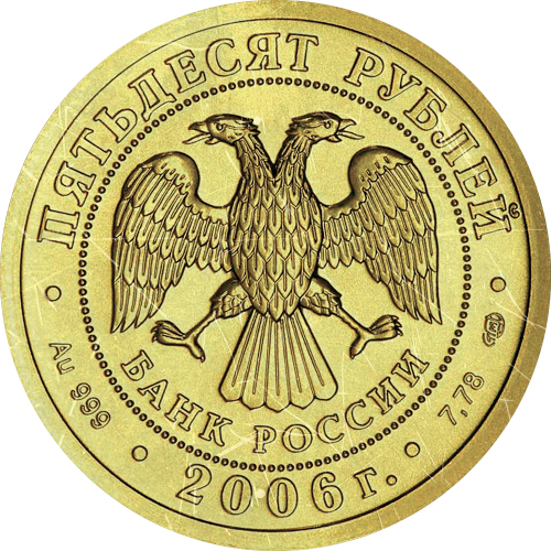 в центре - эмблема Банка России (двуглавый орёл с опущенными крыльями, под ним - надпись полукругом "БАНК РОССИИ"), обрамленная кругом из точек и надписями по кругу - вверху: "ПЯТЬДЕСЯТ РУБЛЕЙ", внизу: слева - обозначения драгоценного металла и пробы сплава, в центре - дата выпуска "2009 г.", справа - содержание химически чистого металла и товарный знак монетного двора.